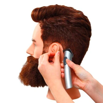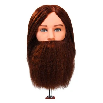 Kopf mit hellbraunem Echthaar, mit natürlichem Haarfall, mit Vollbart aus Büffelhaar und weichem Gesicht und beweglichen Ohren. Haarlänge: ca. 20 cm. Verwendung: Schneiden, Färben, Frisieren, speziell für Bartschnitte.