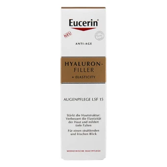 Eucerin HYALURON-FILLER + ELASTICITY Augenpflege enthält LSF 15 und einen UVA-Filter für zusätzlichen Schutz vor UV-Strahlung, die Falten vertiefen und die Hautalterung beschleunigen kann.Parfümfrei und nicht komedogen, augenärztlich getestet und für Kontaktlinsenträger geeignet.