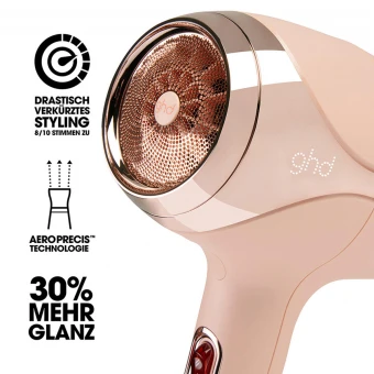 Leichter und schneller für ultimative Stylingkontrolle und Ergebnisse. Der ghd helios® wurde von ghds führendem Forschungs- und Entwicklungsteam in Cambridge, UK in Zusammenarbeit mit Top-Physikern, Ingenieuren und professionellen Stylisten entwickelt. Der ultra starke Haartrockner verkürzt, durch seine optimierte Performance, die Trocknungszeit drastisch.* Der 2.200 Watt Motor und das wellenförmige Heizelement erzeugen einen konzentrierten Luftstrom mit 120 km/h, für ein schnelles Styling. Die Aeroprecis™ Technologie kombiniert die interne Aerodynamik mit der maßgeschneiderten Düse und erzeugt so einen konzentrierten Luftstrom und eine gleichmäßige Temperaturverteilung für eine verbesserte Stylingkontrolle und Stylingergebnisse in Salon-Qualität. Die fortschrittliche Ionen-Technologie reduziert Frizz und abstehendes Haar für geschmeidige Ergebnisse mit 30 % mehr Glanz.**