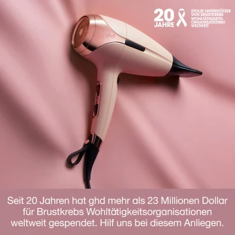 ghd pink collection. In den letzten 20 Jahren hat ghd weltweit mehr als 23 Millionen Dollar für Brustkrebsorganisationen gesammelt und engagiert sich weiterhin dafür, Jahr für Jahr weitere Spenden zu generieren. Das Abtasten der Brüste ist für alle Frauen wichtig, denn Früherkennung rettet Leben. Deshalb wurde der exklusive ghd helios® Haatrockner so entwickelt, dass er mit ‘Take Control Now’ eine Erinnerung an das regelmäßige Abtasten enthält. Die Limited Edition enthält den ghd pink helios® Haatrockner in Light Peach Pink zusammen mit einem farblich passenden Travel Bag.