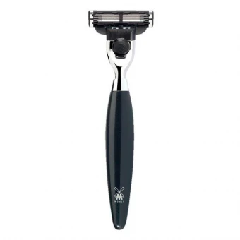Der MÜHLE KOSMO 3-Klingen-Rasierer mit Gillette® Mach3® und einem Griff aus Edelharz in schwarz mit verchromten Metallakzenten.