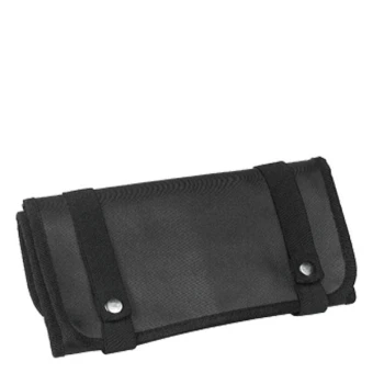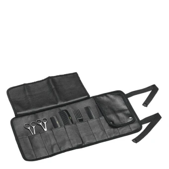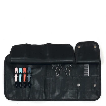 Werkzeugetui für Kämme und Scheren, schwarz aus PVC. Geschlossen: B x H 26 x 13 cm. Geöffnet: B x H 26 x 53 cm.